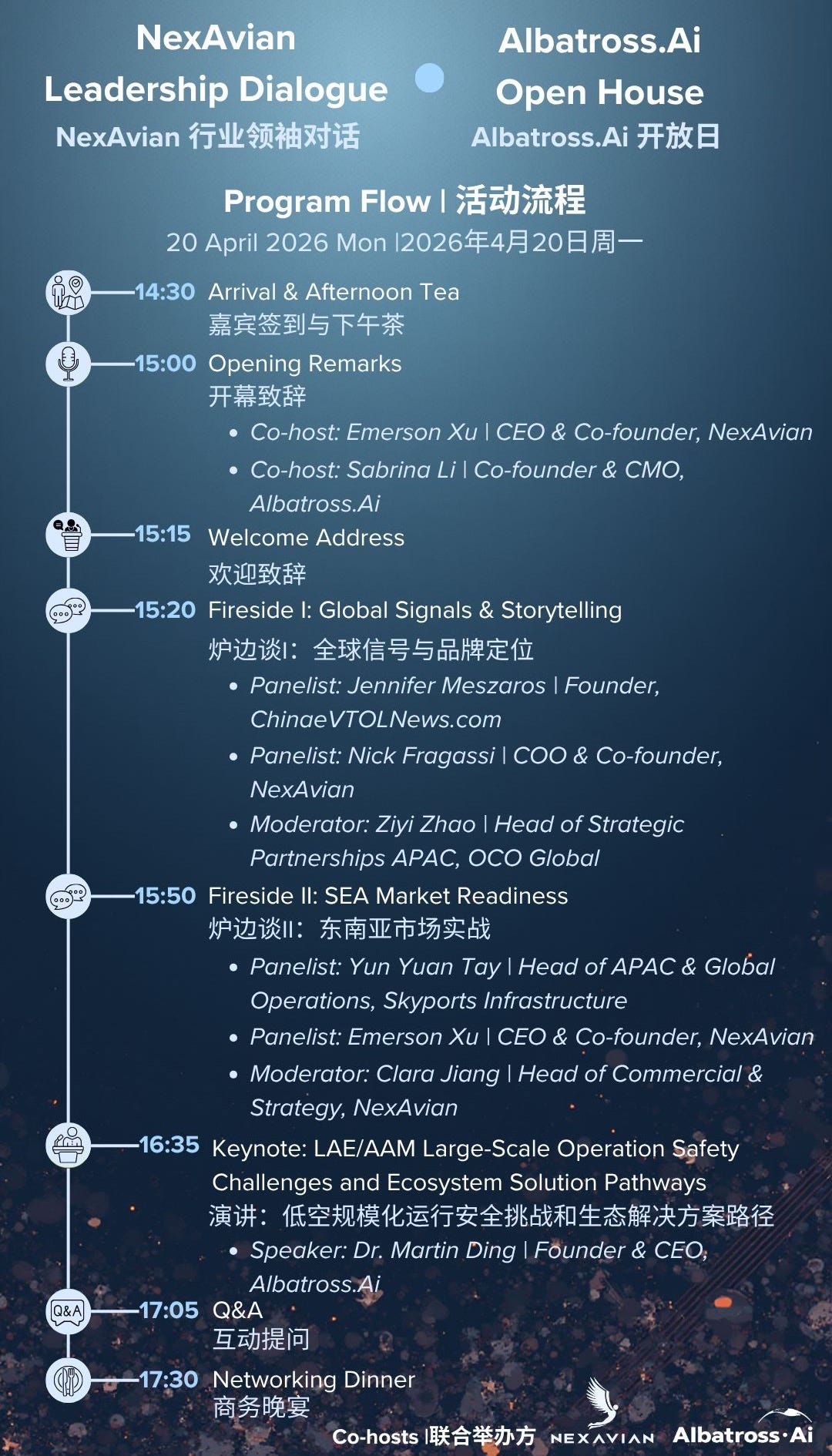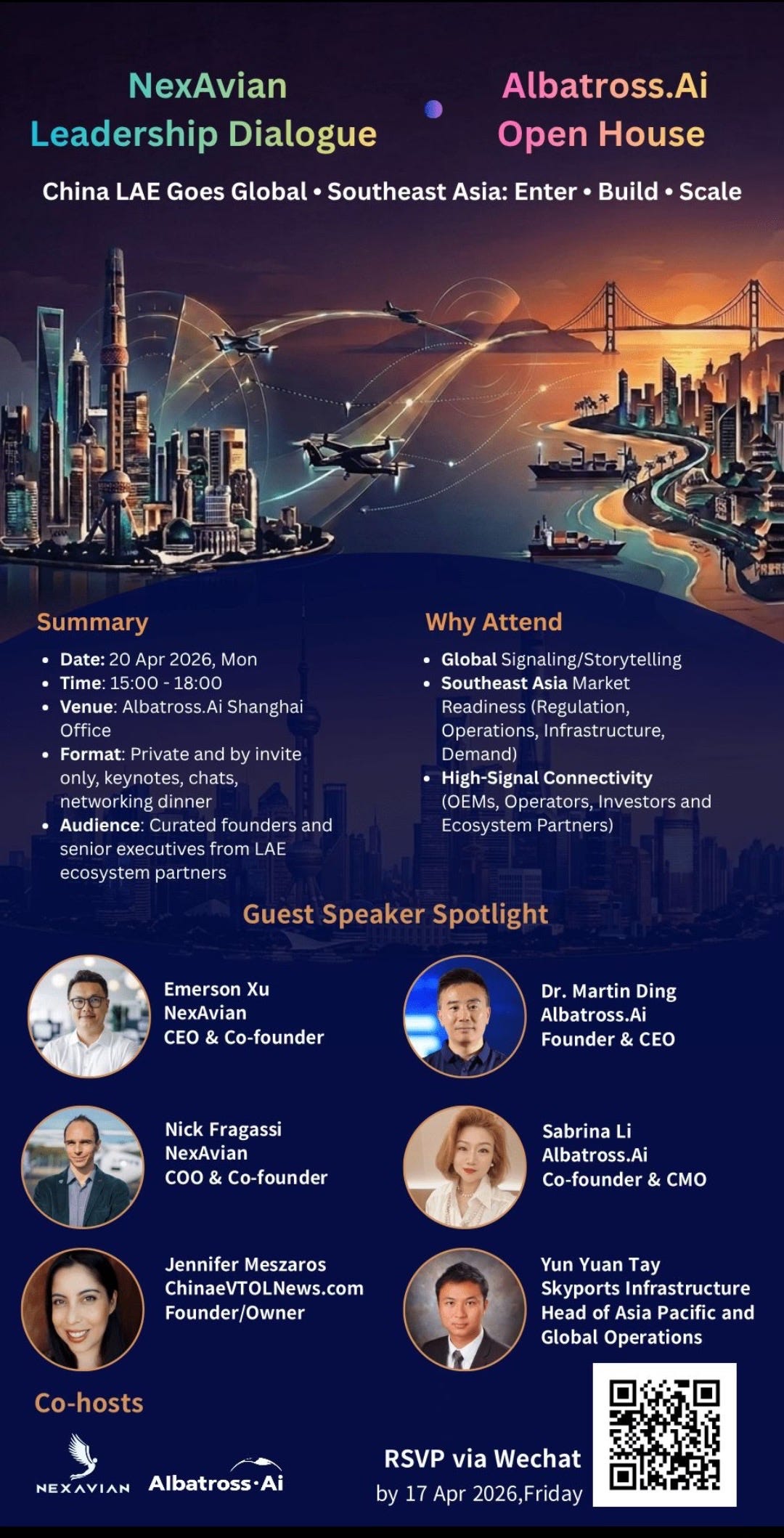 The event is hosted by NexAvian (a Singapore-based consultancy that connects ecosystems in Advanced Air Mobility) and Albatross.ai (a Tianjin-based aviation tech company focused on autonomous avionics for the low‑altitude economy).