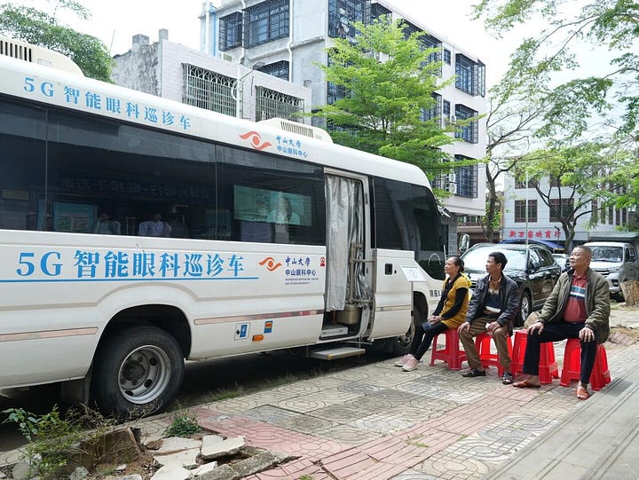 A 5G intelligent ophthalmic mobile clinic operated by the Zhongshan Ophthalmic Center conducted preliminary screenings in townships including Tanmen and Dalu, covering more than 600 residents.