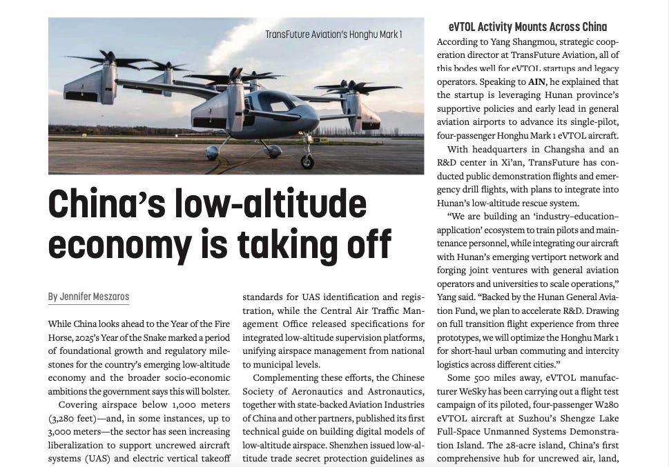 For Aviation International News, I wrote a general overview of China’s low-altitude economy, featuring WeFly, TransFuture Aviation, and business jet management company SinoJet, who has a confirmed order for 50 AE200 eVTOL aircraft from Aerofugia.