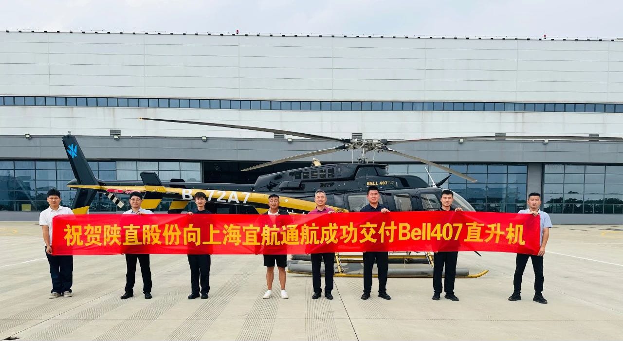 On August 8, Shaanxi Helicopter Co., Ltd. (陕西直升机股份有限公司) delivered a Bell 407GXI helicopter to Shanghai Yihang General Aviation Co., Ltd. (上海宜航通用航空有限公司).